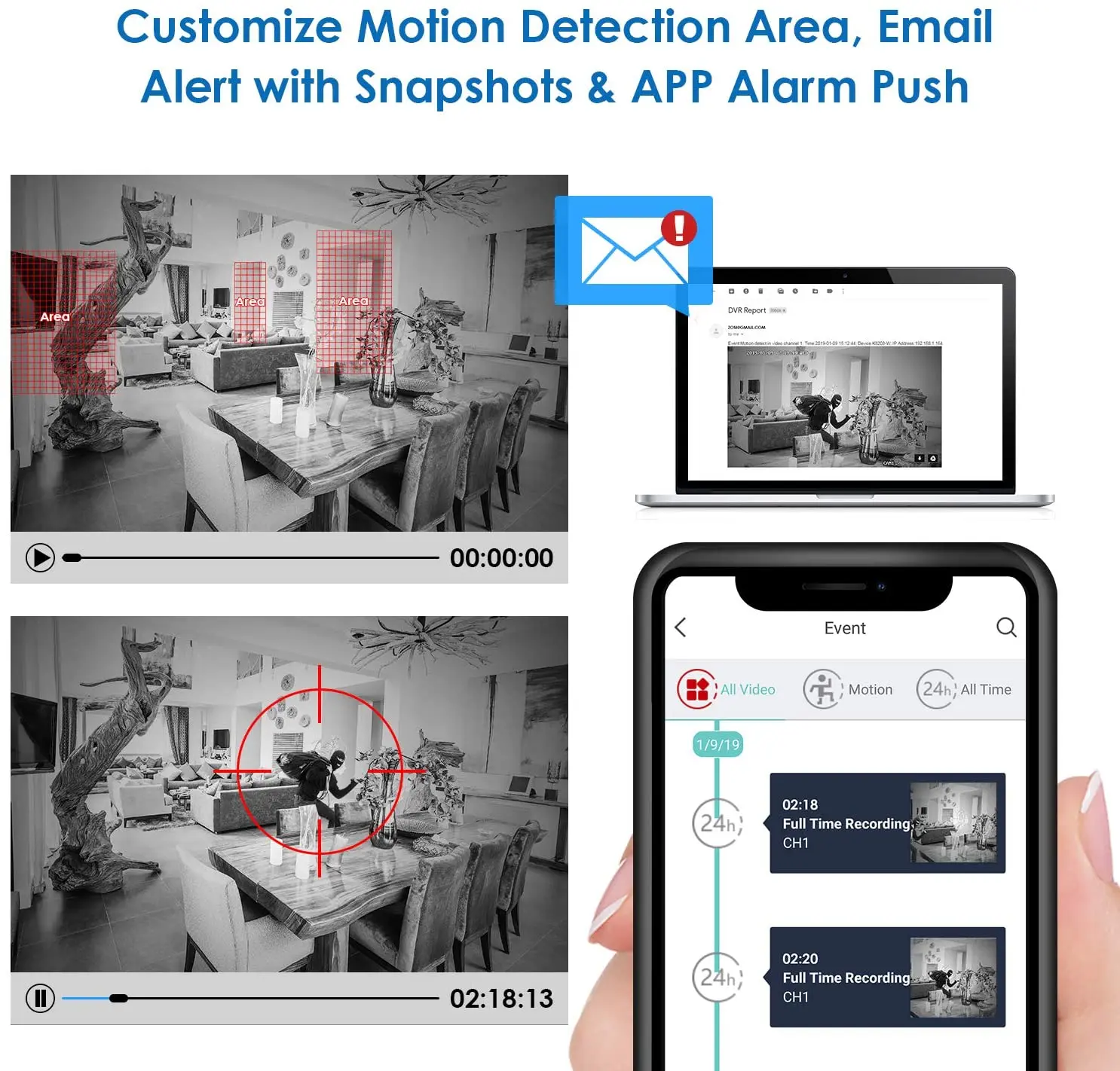 Everything is sharp and clear in fine image quality with 90° wide viewing angle. This camera always keep an eye on your home and business in full 1080p HD resolution.